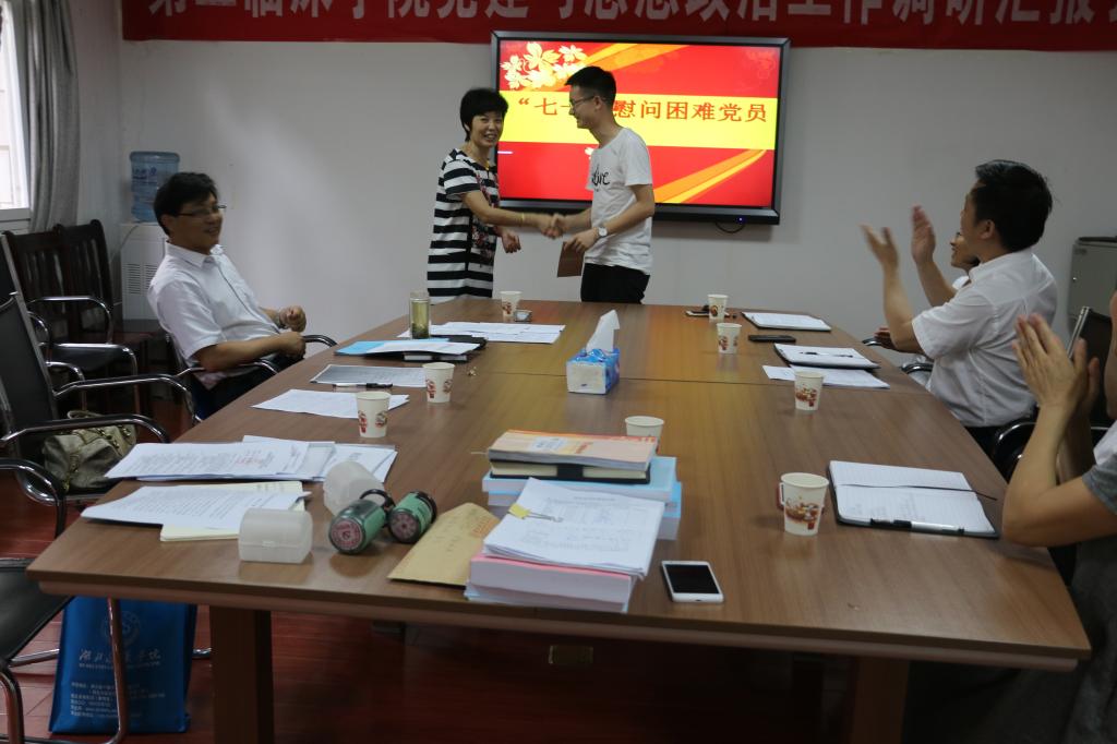 之后,7月1日当天,学院分党委前往郧阳区柳陂镇贫困学生党员王德东家开展了慰问活动。分党委成员一行来到王德东家中,详细了解了王德东及家人的生活情况,并为其送上了慰问金,以此勉励其树立远大理想抱负,好好学习,争取更大的进步。7月3日,学院分党委召开专题会议,总结表彰了2013级学生党员孙佳森奋不顾身、只身火海、救人灭火的光荣事迹。孙佳森是一位贫困党员,总结会上学院分党委对其进行了七一慰问。孙佳森出生在贫苦的农村家庭,从他记事起,父亲就因患病而不能从事体力劳动,母亲也由于常年劳累患上严重的肾病,孙佳森10岁时患上了全身性银屑病。孙佳森虽然家庭十分困难,但他始终不坠青云之志,勤奋学习,无私奉献,怀着对党对人民无比热爱的赤诚之心,坚持服务他人,关心社会,彰显了二院学子良好的精神风貌。
