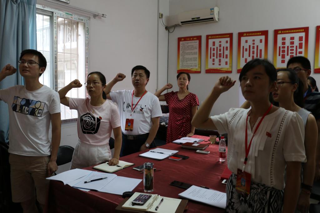 活动严格按照学校7+X模式开展。全体党员佩戴党徽,起立齐唱国歌;面对党旗庄严宣誓,重温入党誓词;集体诵读党章。集中学习了习近平总书记在省部级主要领导干部“学习习近平总书记重要讲话精神,迎接党的十九大”专题研讨班开班式上的重要讲话、在庆祝中国人民解放军建军90周年大会上的讲话、在全国金融工作会议上的讲话以及十堰市委书记张维国同志在7月6日市委常委会会议讲话精神、市创文指挥部《致全市人民的一封公开信》、市创文办《创建全国文明城市应知应会知识手册》、市政府《十堰竞演<魅力中国城>倡议书》等“创文”主题知识、市委组织部关于“魅力中国城+创文”专题党支部主题党日活动的通知。党员们还订阅了“十堰基层党建”微信公众号。