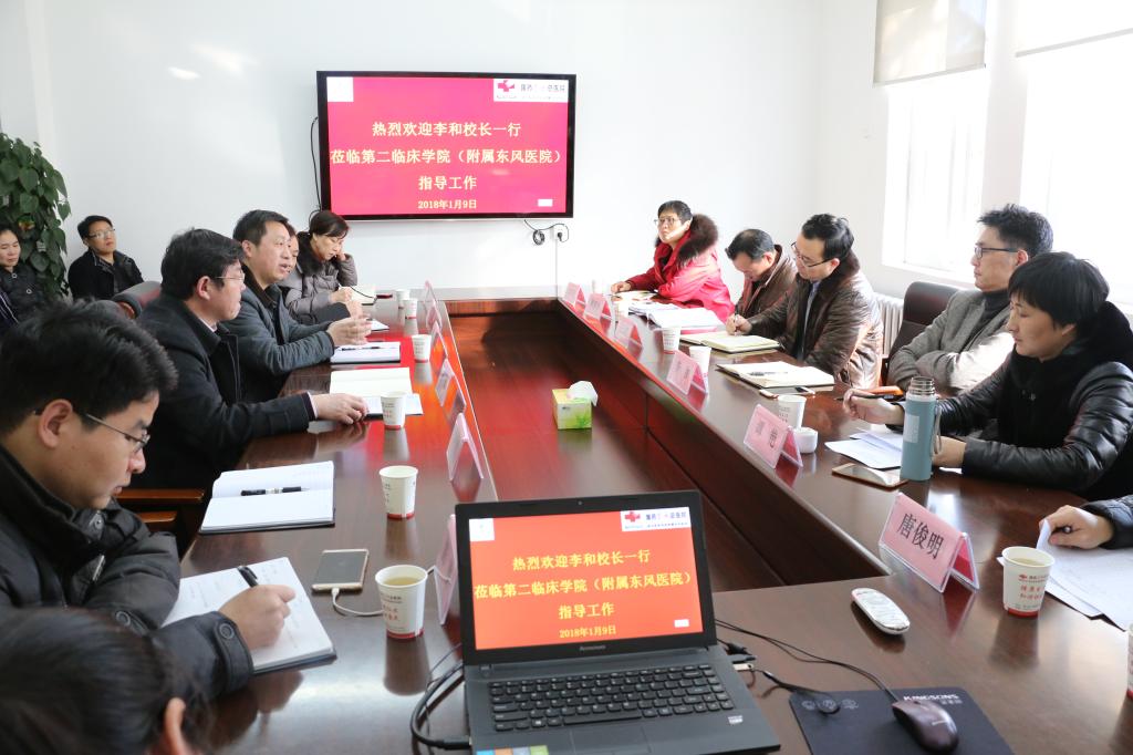 本网讯(通讯员 王佰灵)2018年1月9日下午,李和校长、王云甫副校长一行七人莅临第二临床学院、附属东风医院调研科技工作。第二临床学院院长、附属东风医院党委书记李斌,第二临床学院分党委书记邵义光等陪同调研。